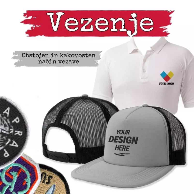 Vezenje na tekstil, ki ga v Sloveniji po naročilu izvajamo pri nas, je ena najbolj obstojnih rešitev za tisk motiva, saj ima nekajkrat daljšo življenjsko dobo od ostalih vrst tiska. Nikoli ne izgubi svojega sijaja, saj za vezenje uporabljamo sukanec, motiv pa je izvezen s pomočjo računalniškega programa R300, zato lahko jamčimo za kvaliteto izvezenega motiva.