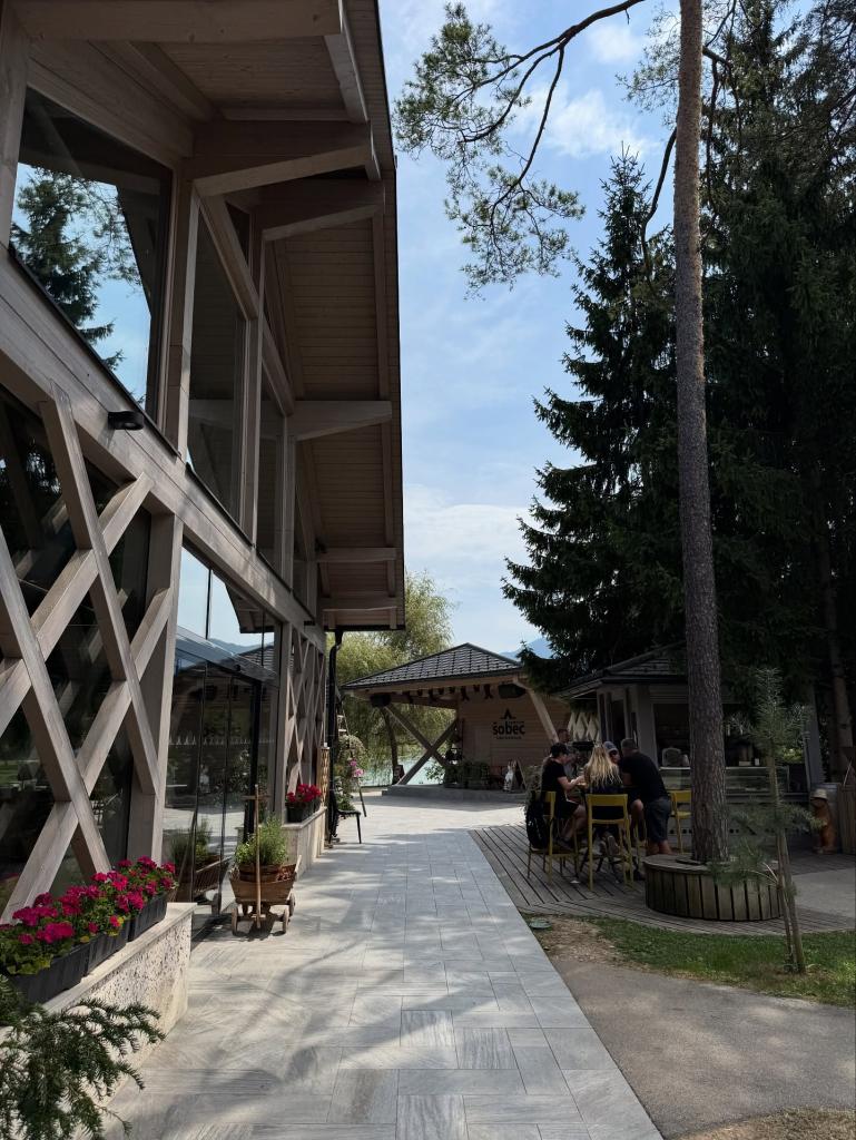 V Restavraciji Šobec smo se ustavili na kosilu po sprehodu ob jezeru. Hrana je bila okusna, porcije pa ravno prav velike. Razgled na okolico naredi izkušnjo še lepšo.