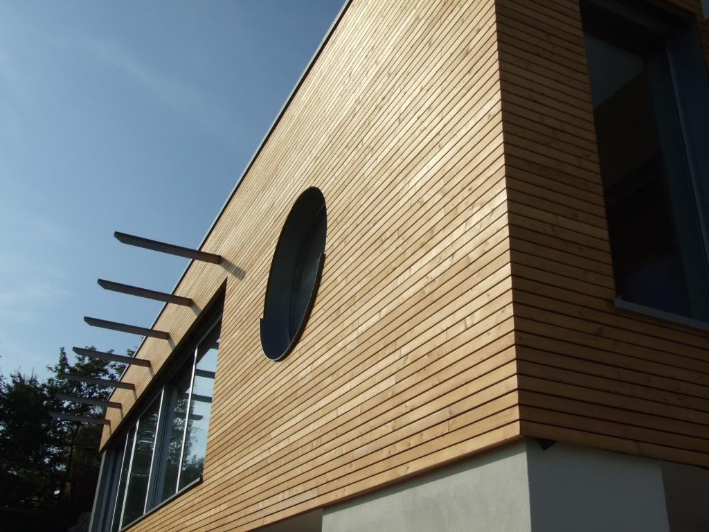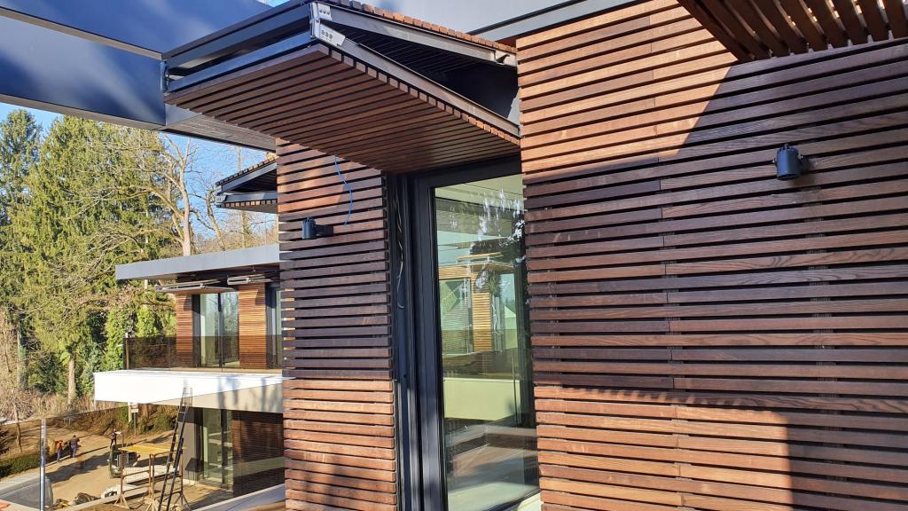 Naše fasade so izdelane iz Kompakt plošč. Pod leseno fasado se najprej postavi ALU, nato pa postavimo konstrukcijo na katero prilepimo plošče s posebnim Sikaflex lepilom. Sprednji del je kombiniran z leseno fasadno oblogo. Za pritrjevanje uporabimo sistem za nevidno vijačenje fasad.