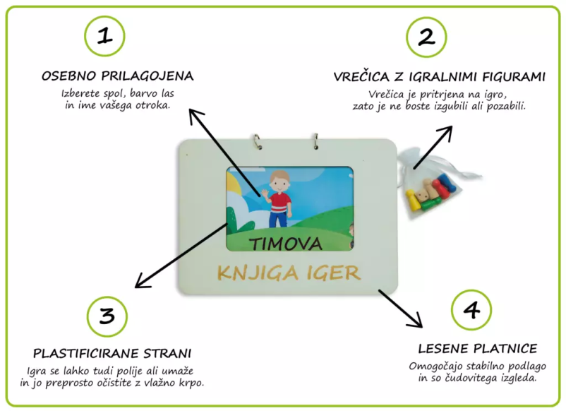 Moja knjiga iger je osebno prilagojena knjiga iger, ki vsebuje 3 poučne družabne igre in 3 zgodbe, v katerih glavno vlogo igra vaš otrok. Vpišite ime vašega otroka in določite barvo las.