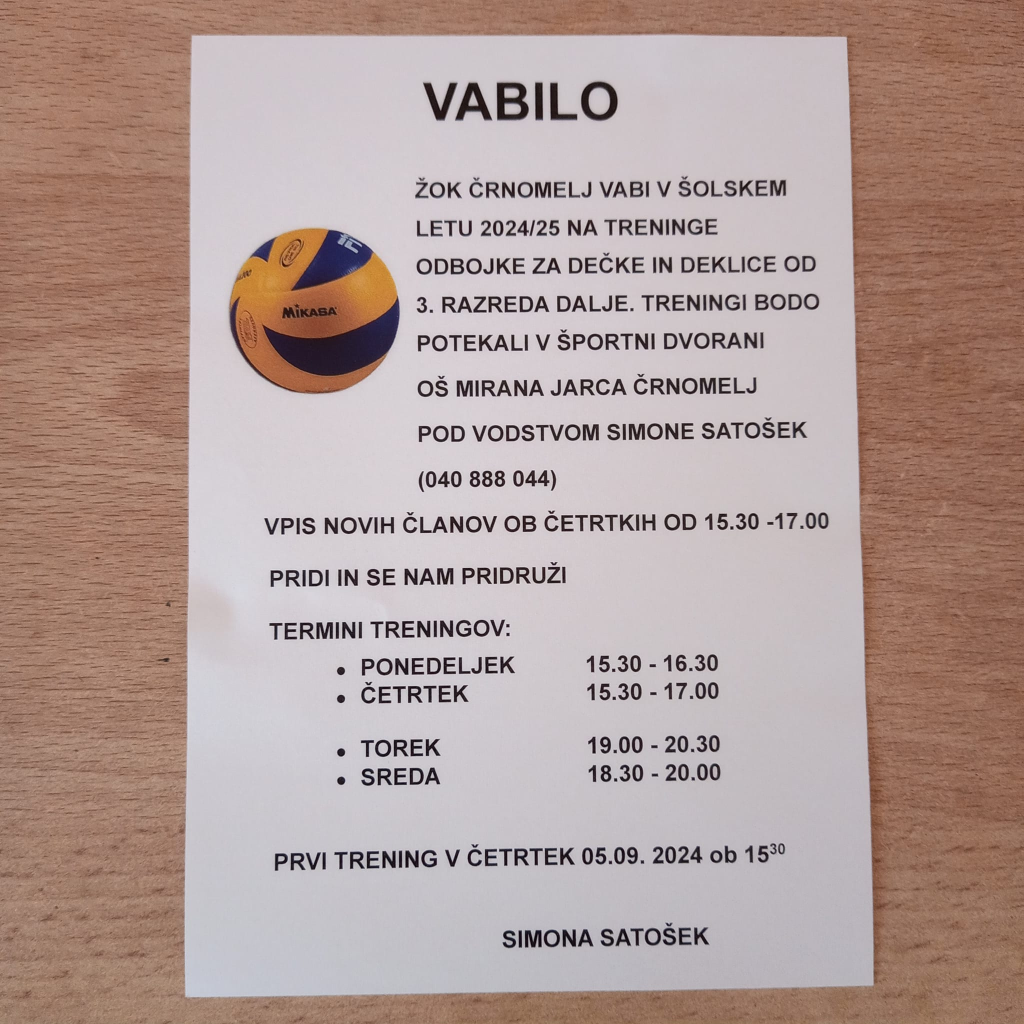 Ženski odbojkarski klub Črnomelj organizira trening odbojke za ženske v Črnomlju v Beli krajini. Vpisujemo vse deklice od 3. razreda naprej. Treningi bodo potekali v športni dvorani OŠ Mirana Jarca Črnomelj pod vodstvom Simone Satošek.